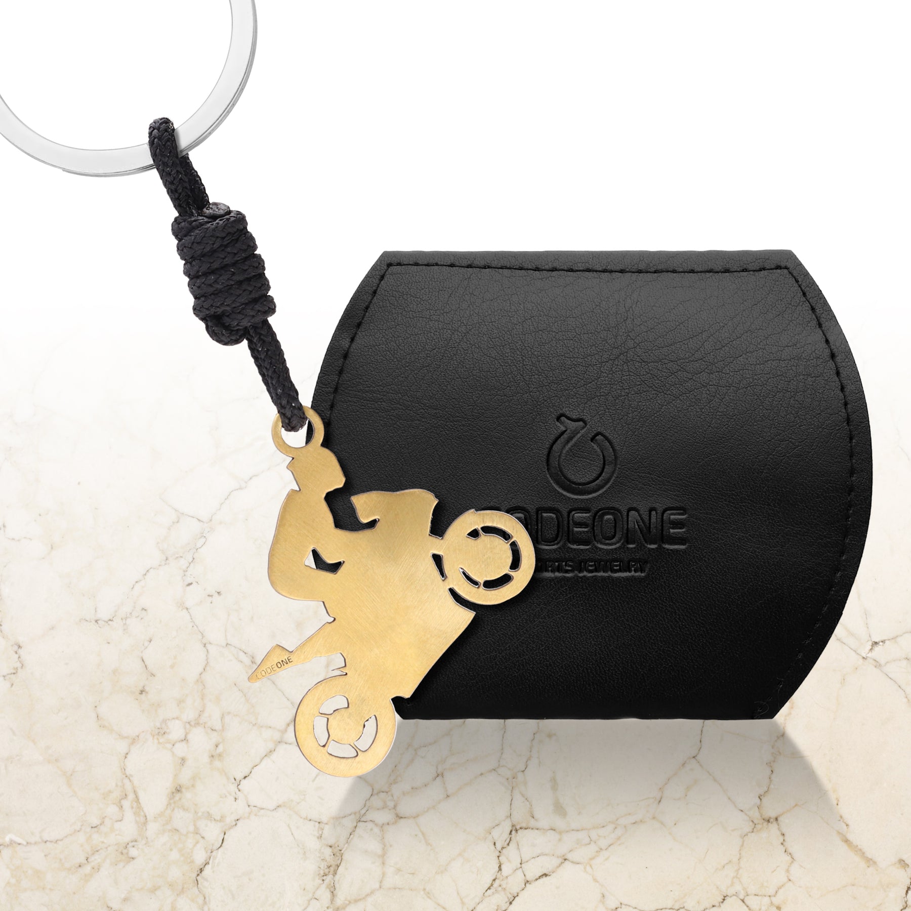 Competition motorcyclekeychainmade of matte stainless steel, with a black ring with engraved brand logo, and a knot decoration with 2mm nylon.