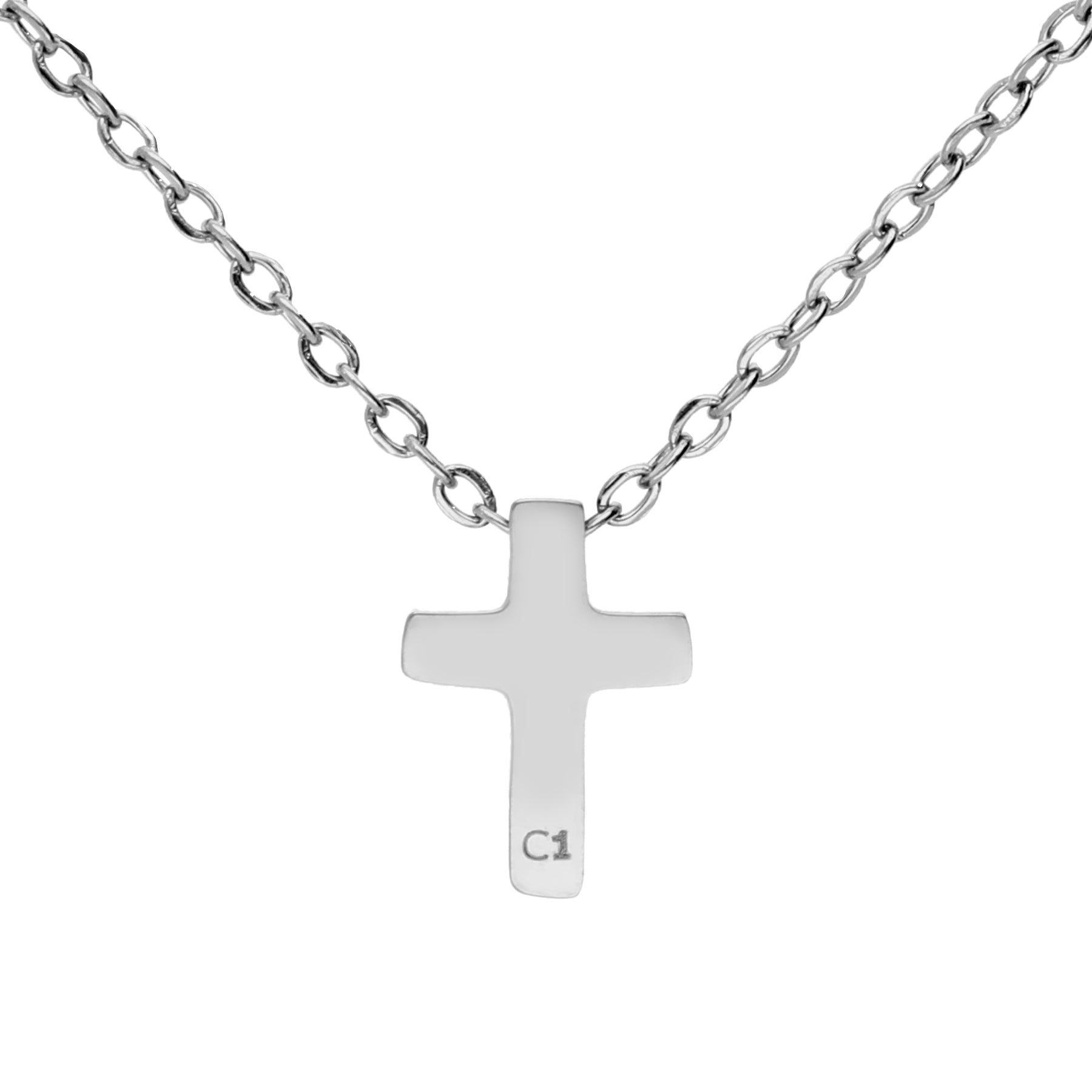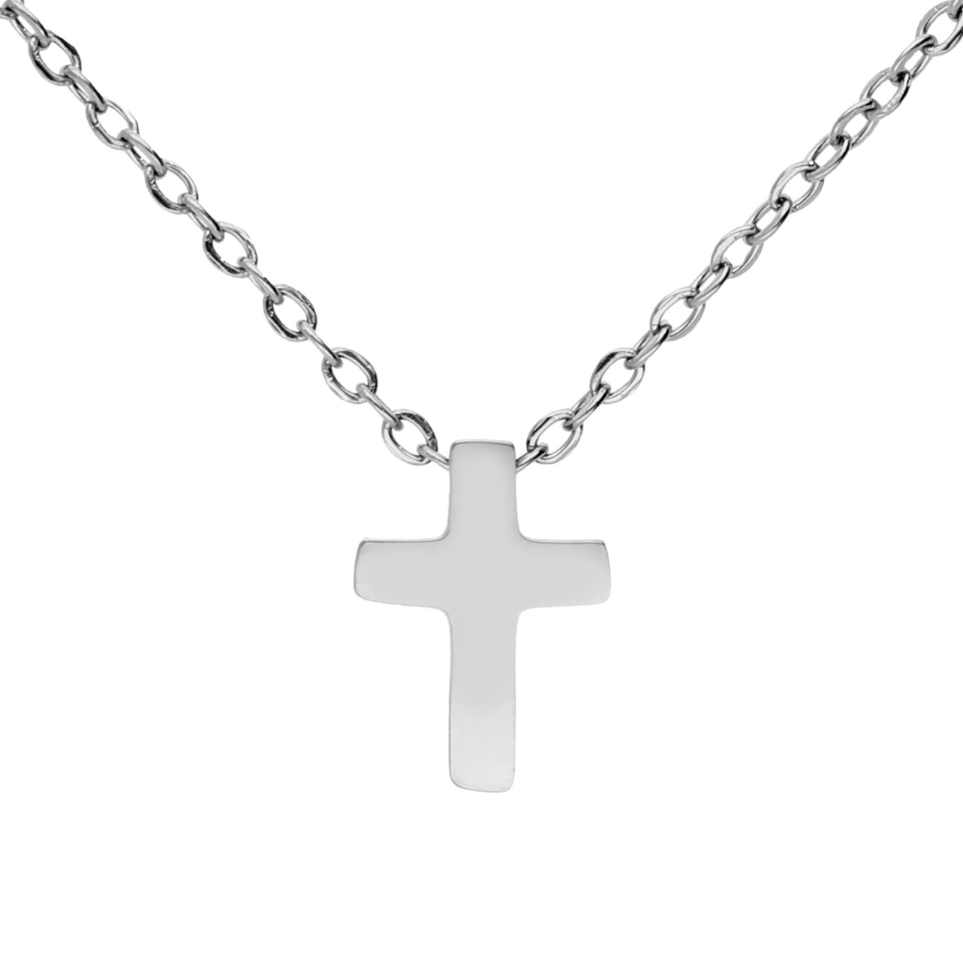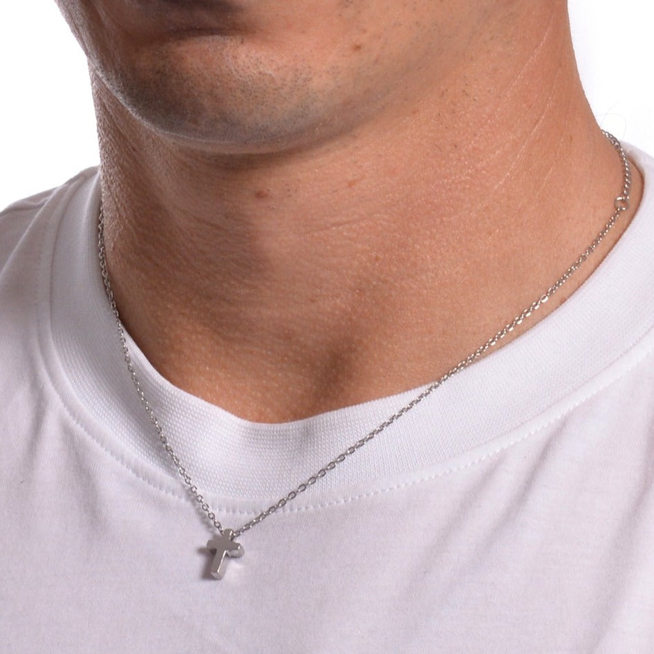 Cross pendant with short chain in silver-plated stainless steel.