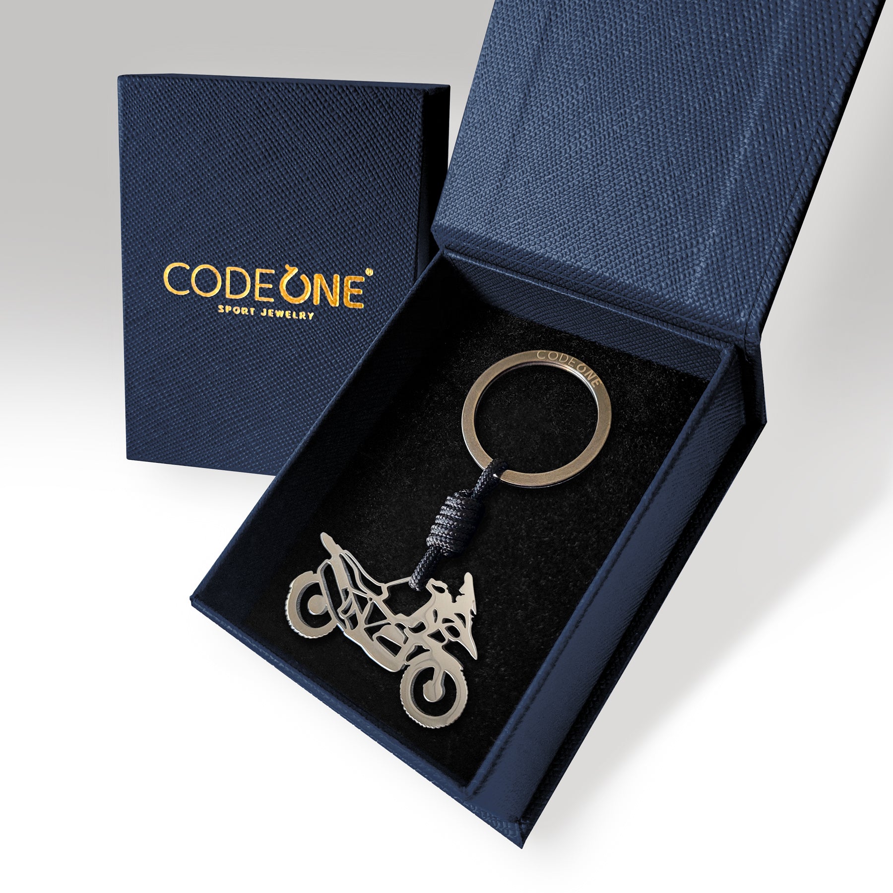 MAXITRAIL MOTORCYCLEKEYCHAIN​​made of matte stainless steel, with a black ring with engraved brand logo, and a knot decoration with 2mm nylon.
