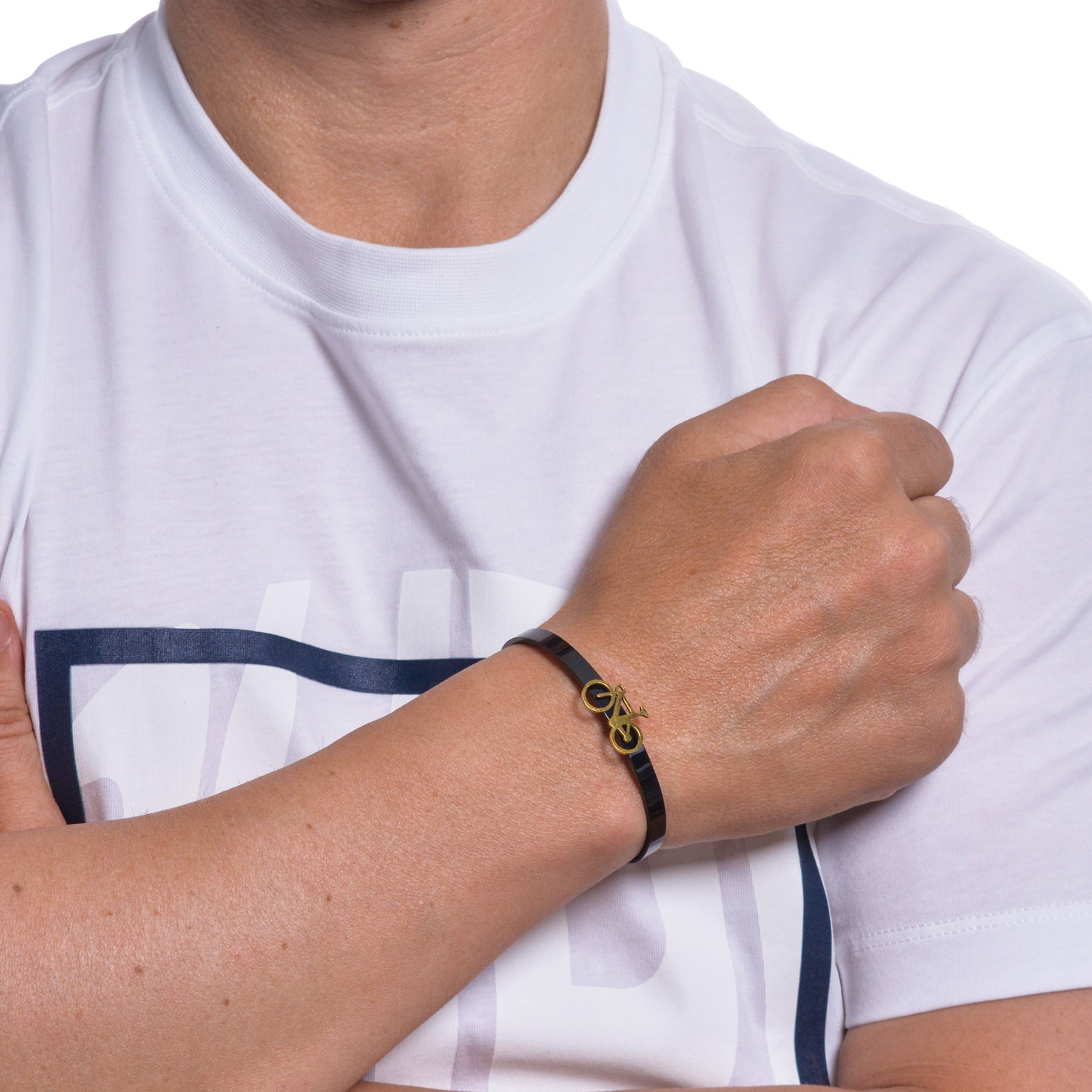 Main motifs: Bicycle on a bracelet in stainless steel plated in yellow gold, black rhodium or platinum.