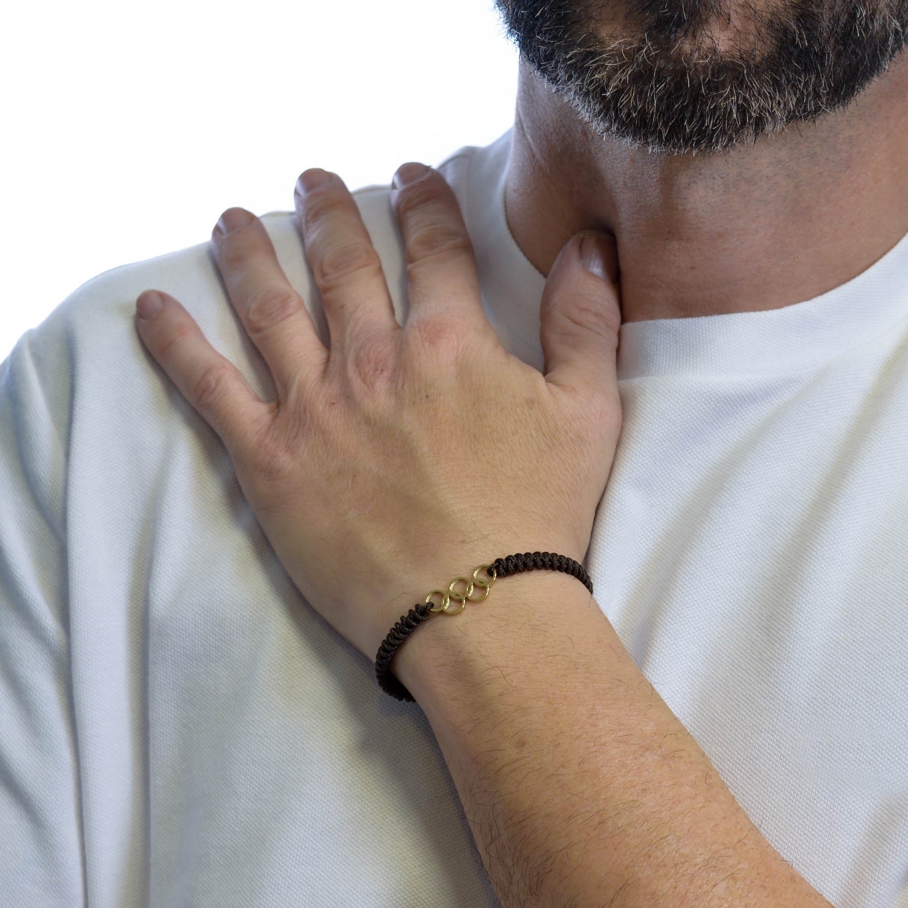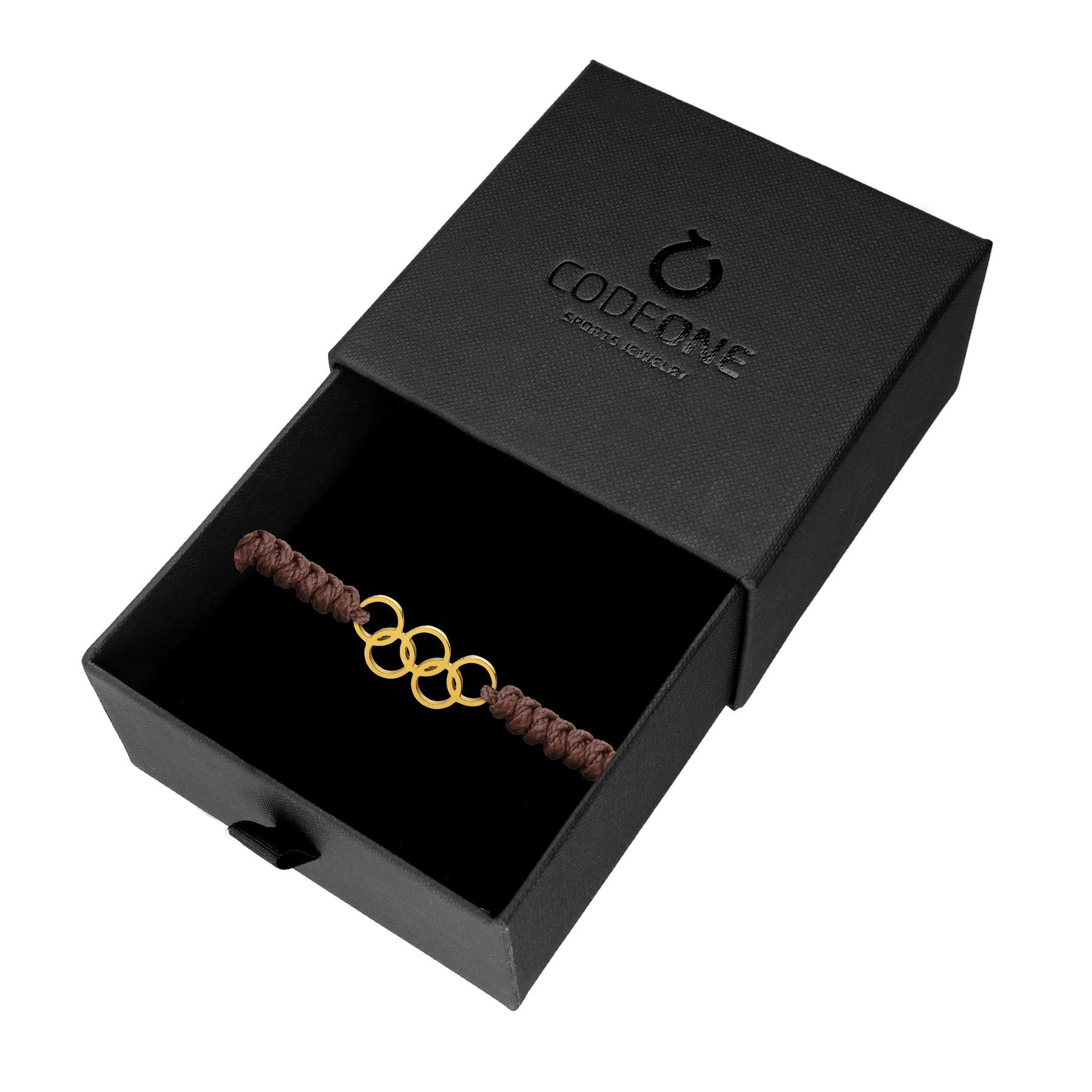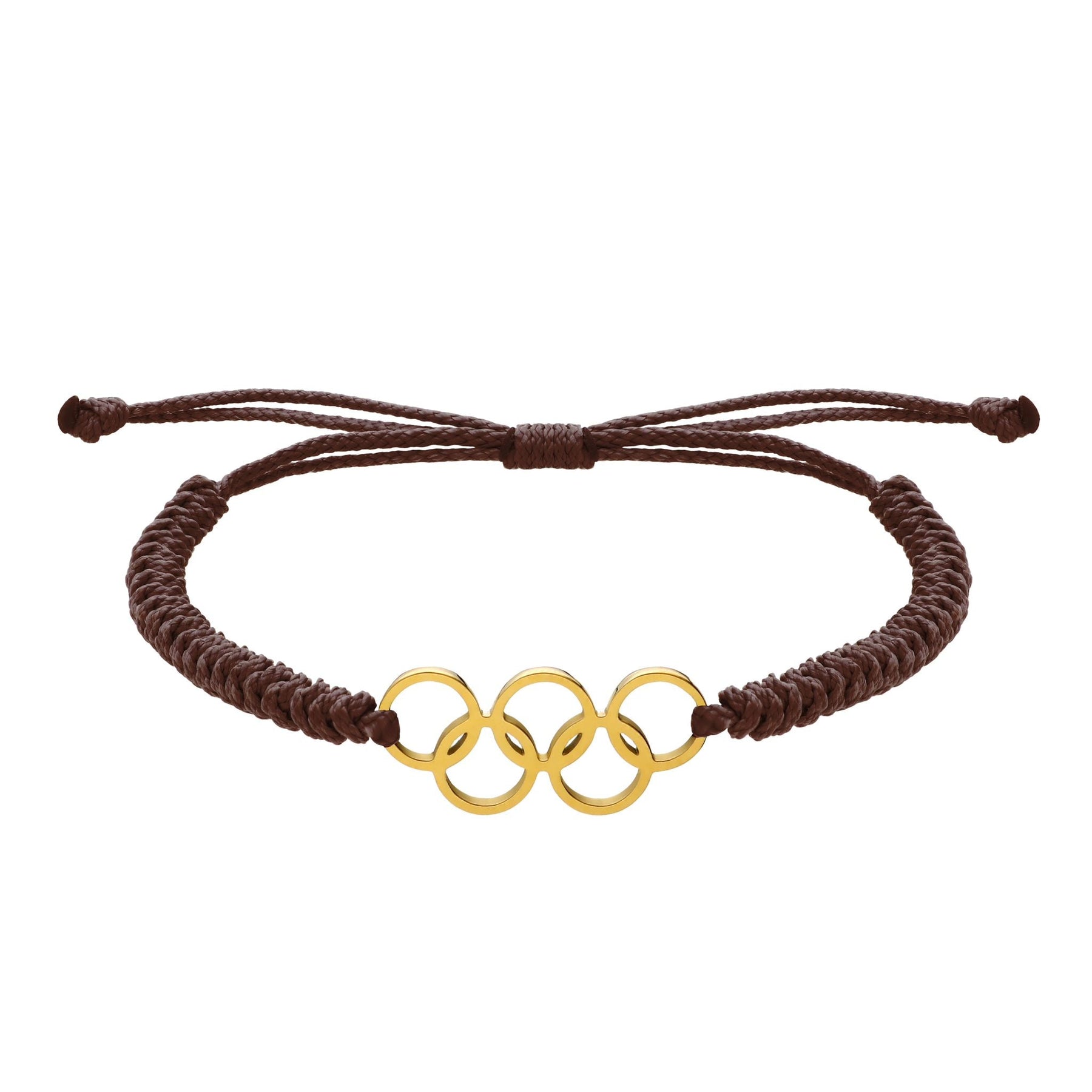 Main features: Olympic hoops in gold-colored stainless steel, brown braided nylon. Handmade in our own factory.