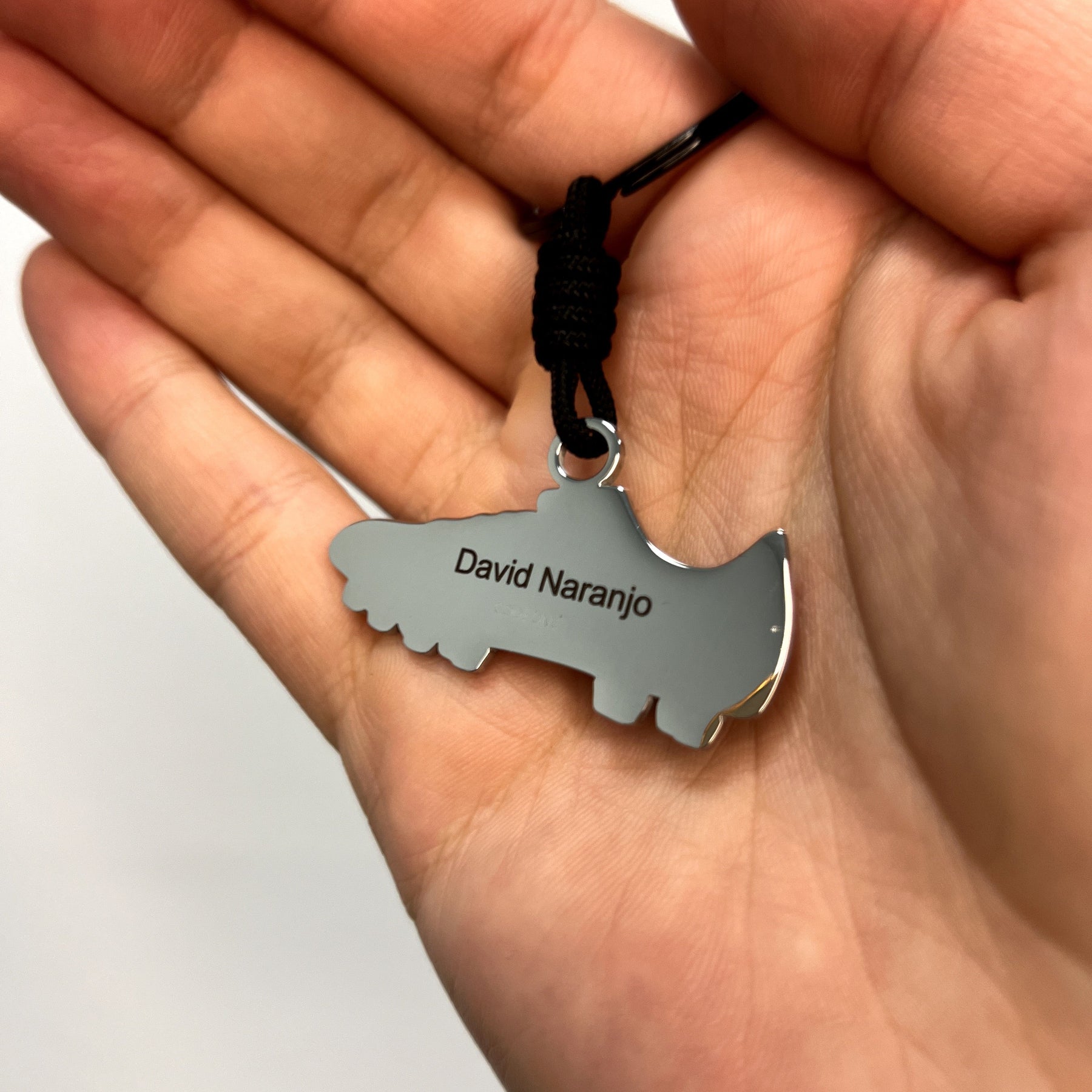 LLAVERO BOTA FUTBOL fabricado en Acero Inoxidable mate, con aro color negro con logotipo de la marca grabado, y adorno de nudo con nylon de 2mm.