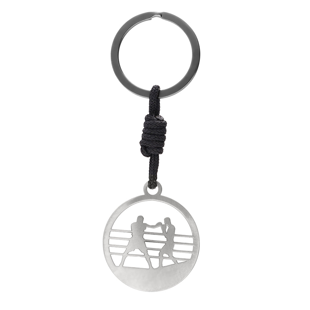 LLAVERO RING DE BOXEO fabricado en Acero Inoxidable mate, con aro color negro con logotipo de la marca grabado, y adorno de nudo con nylon de 2mm.
