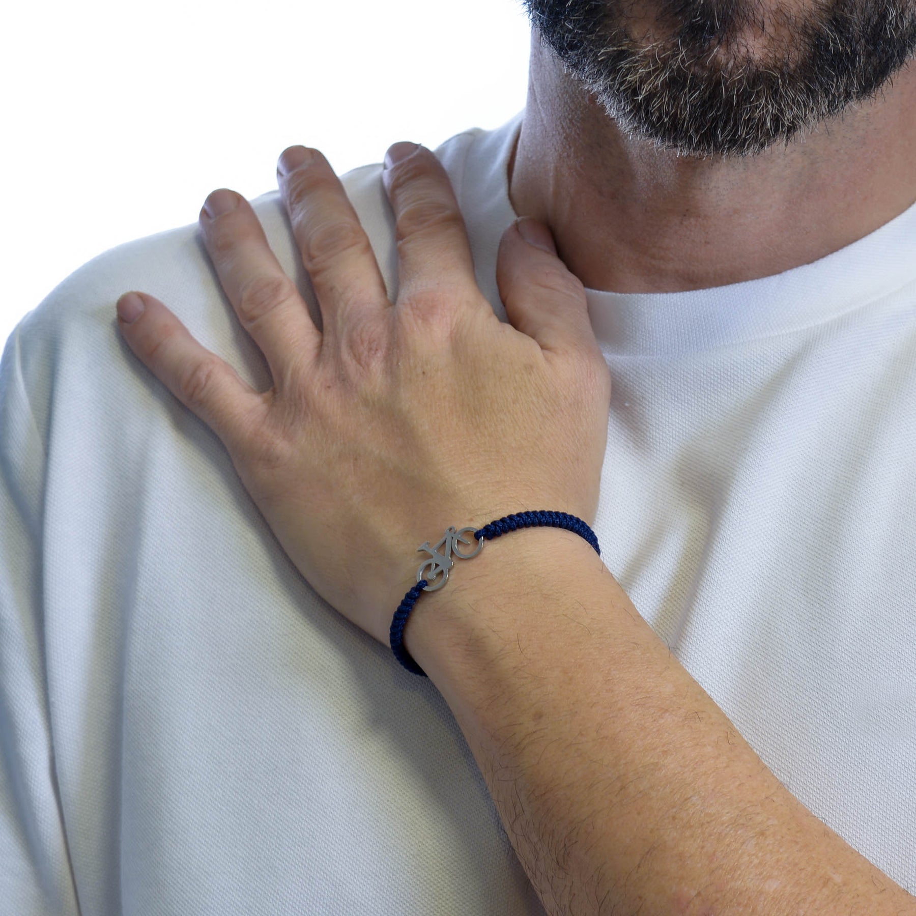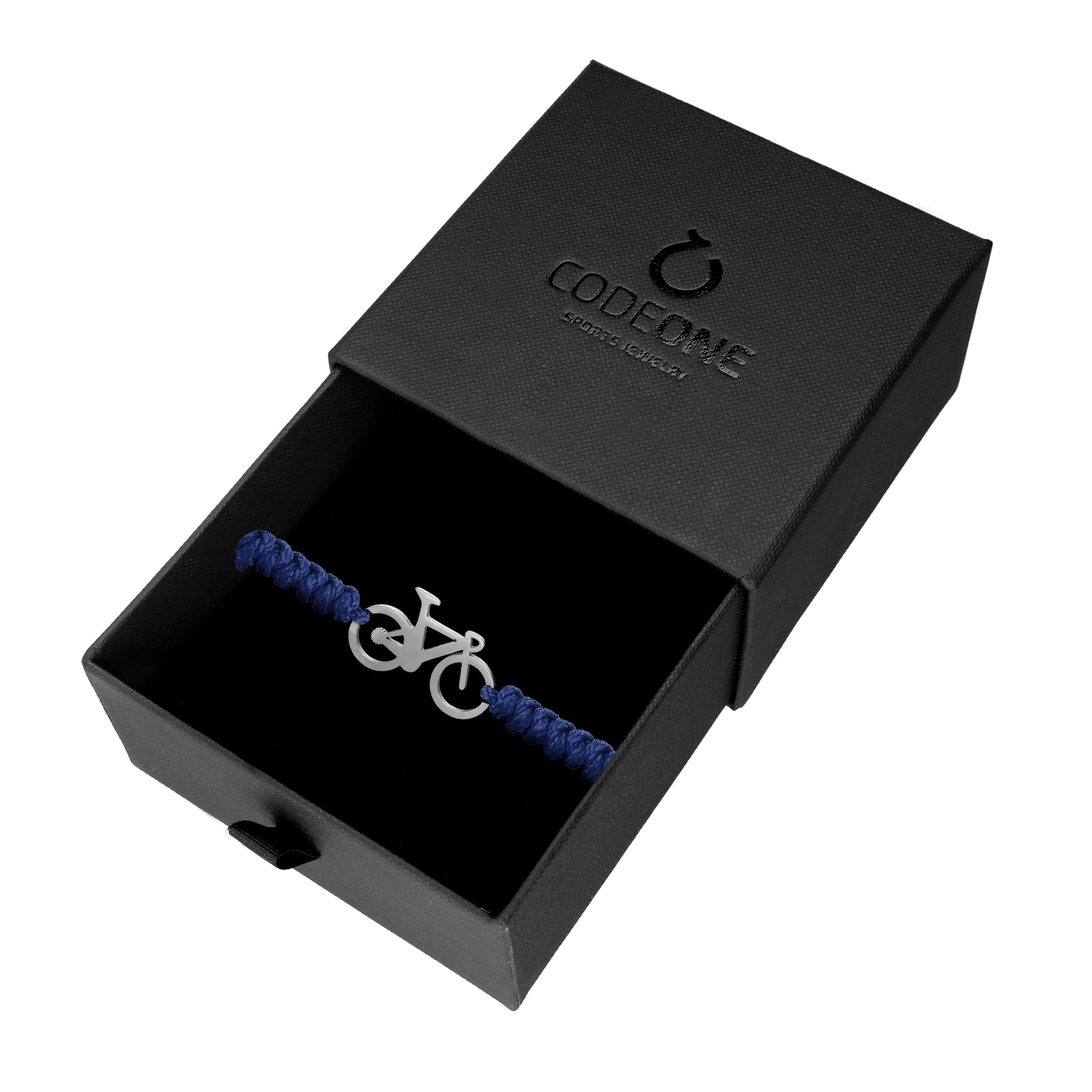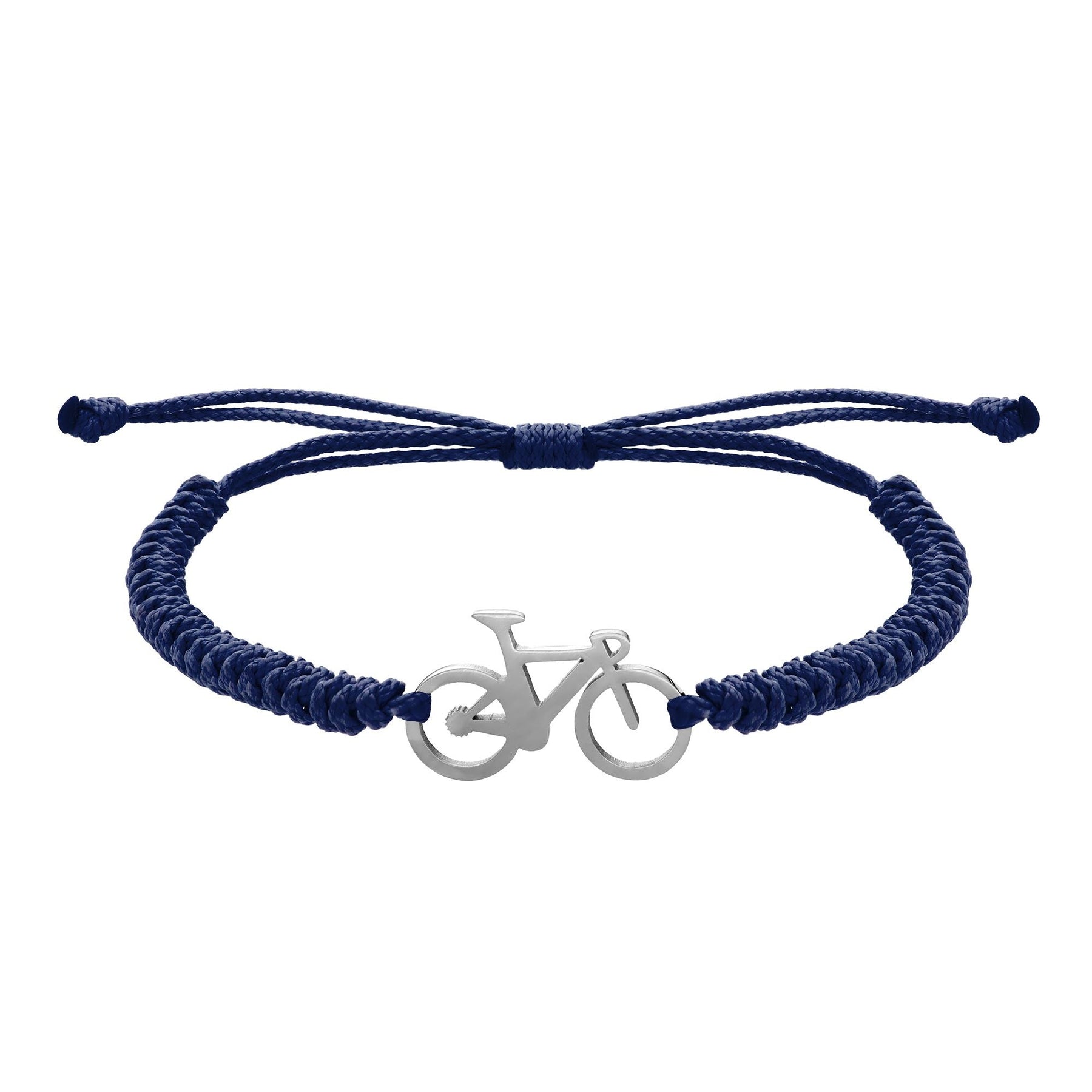 Road bikebraceletmade of stainless steel, with a hand-stitched structure using durable nylon thread. One size fits all, fully adjustable to any wrist, with sliding knots.